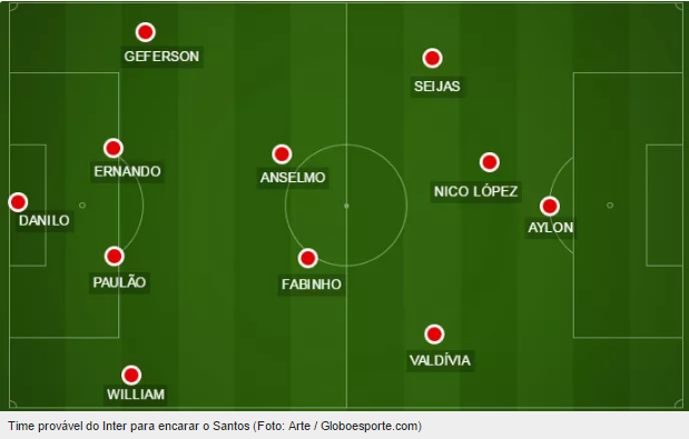 O Inter que treinou e deve encarar o Peixe nesta quinta-feira, no Beira-Rio, teve: Danilo Fernandes; William, Paulão, Ernando e Geferson; Anselmo, Fabinho, Seijas e Valdívia; Nico López e Aylon. Já a equipe reserva trabalhou com: Lomba; Ceará, Alan Costa, Eduardo e Artur; Fernando Bob, Eduardo Henrique, Anderson e Alex; Eduardo Sasha e Vitinho.